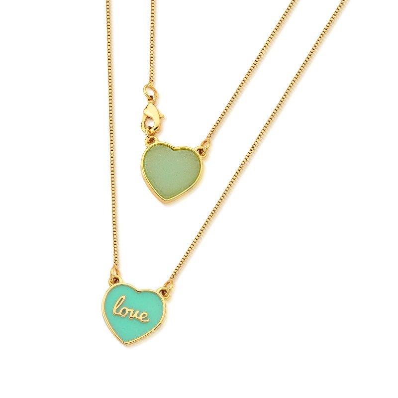 COLEÇÃO HAPPY. Pingente com pedra em formato de coração 12x13mm com medalha escrito ''LOVE''. Acompanha corrente veneziana de 92cm no total, possibilitando usá-la dupla no pescoço. Possui detalhes esmaltados em verde.