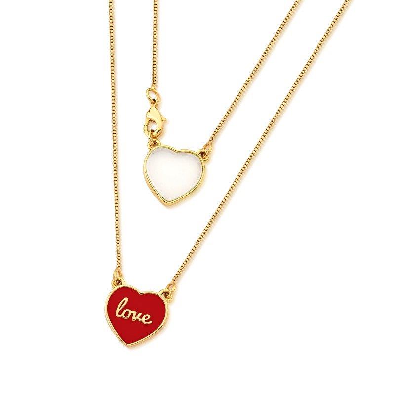 COLEÇÃO HAPPY. Pingente com pedra em formato de coração 12x13mm com medalha escrito ''LOVE''. Acompanha corrente veneziana de 92cm no total, possibilitando usá-la dupla no pescoço. Possui detalhes esmaltados em vermelho.