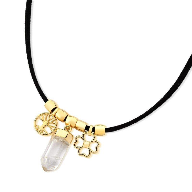 LINHA TRADIÇÃO. Enfeite de cuia em cordão encerado com pingente com ponta de cristal em formato de prisma, acompanha pingente da Árvore da vida e o Trevo da Sorte. Tamanho do cordão: 55cm.
