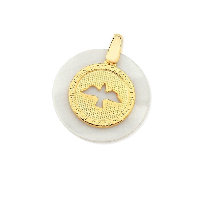 COLEÇÃO RELIGIOSA. Pingente com pedra chapa redonda de 30mm com os dizeres "VINDE ESPÍRITO SANTO, ENCHEI OS CORAÇÕES DOS VOSSOS FIÉIS". Altura do pingente: 3,8cm.
