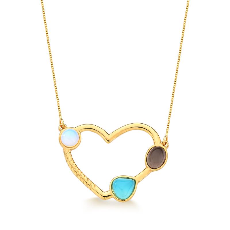 COLEÇÃO CORAÇÃO.Pingente com formato de coração, com três pedras naturais: uma pedra oval de 8x6mm, uma pedra redoda de 6,5mm e uma pedra gota de 8,65mm. Acompanha corrente Veneziana estilo borboleta de 40cm. Por possuir três pedras, o pingente permite compor composições únicas e diferentes. Possui uma delicada textura, trazendo suavidade e beleza a peça.