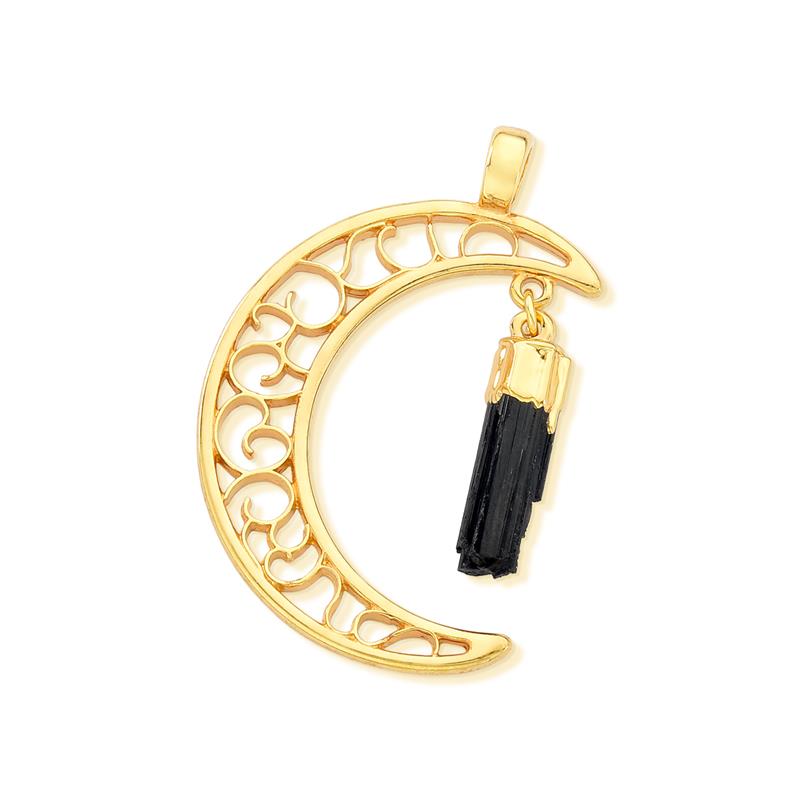 COLEÇÃO RARIDADE. Pingente avulso, sem corrente, em formato de meia lua com detalhes vazados, com pedra de turmalina negra bruta. As pedras variam de 1,5cm a 3cm. Altura total do pingente: 4,8cm