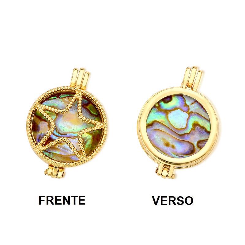 COLEÇÃO MARÉ.Pingente relicário com detalhe de estrela do mar, com pedra de concha sobreposta por um cristal facetado, no formato redondo de 20mm. Cada peça é única, e cada pedra permite transformar seu pingente em uma nova peça. Divirta-se criando combinações e diversos looks, levando com você a energia das pedras naturais.
