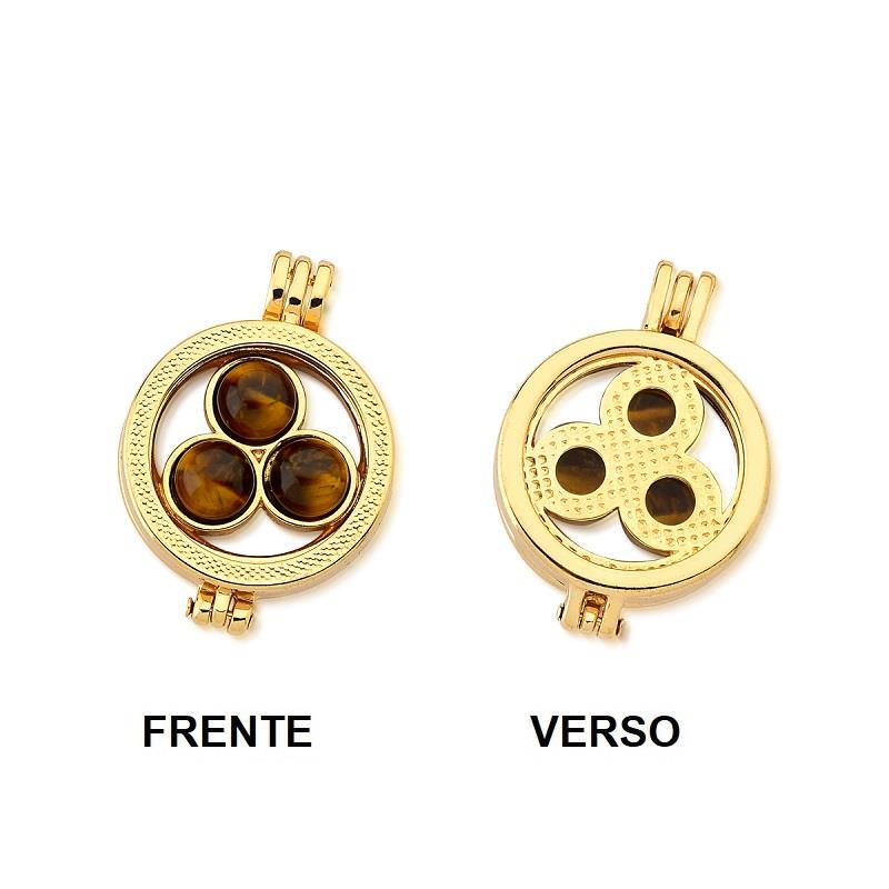 COLEÇÃO RELICÁRIO.Pingente relicário com medalha. Possui 3 pedras cabochão, no formato redondo de 6,5mm. Cada pingente é único, e cada pedra permite transformar seu pingente em uma nova peça. Divirta-se criando combinações e diversos looks, levando com você a energia das pedras naturais.