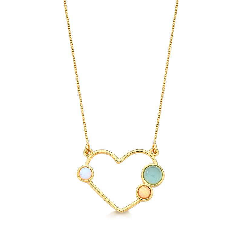LINHA BÁSICA. Pingente com formato de coração, com três pedras naturais de formato redondo: duas de 4mm e outro de 6,5mm. Acompanha corrente Veneziana estilo borboleta de 40cm. Por possuir três pedras, o pingente permite compor composições únicas e diferentes. Altura do pingente: 2,5cm.