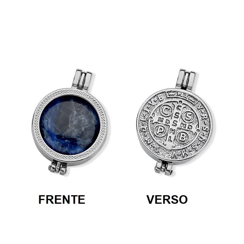 COLEÇÃO RELICÁRIO.Pingente relicário, com pedra cabochão, no formato redondo de 20mm. Possui detalhes no seu interior, trazendo a figura de São Bento, considerado o santo protetor das mulheres e um grande protetor contra a inveja. No seu verso possui a Cruz de São Bento com inscrições, sendo assim considerada um dos mais poderosos escudos protetores contra todo e qualquer mal. A peça pode ser usada dos dois lados.