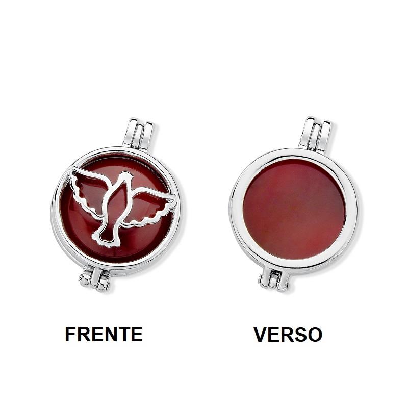 COLEÇÃO RELICÁRIO.Pingente relicário com pedra cabochão, no formato redondo de 20mm. Possui desenho do Espírito Santo.