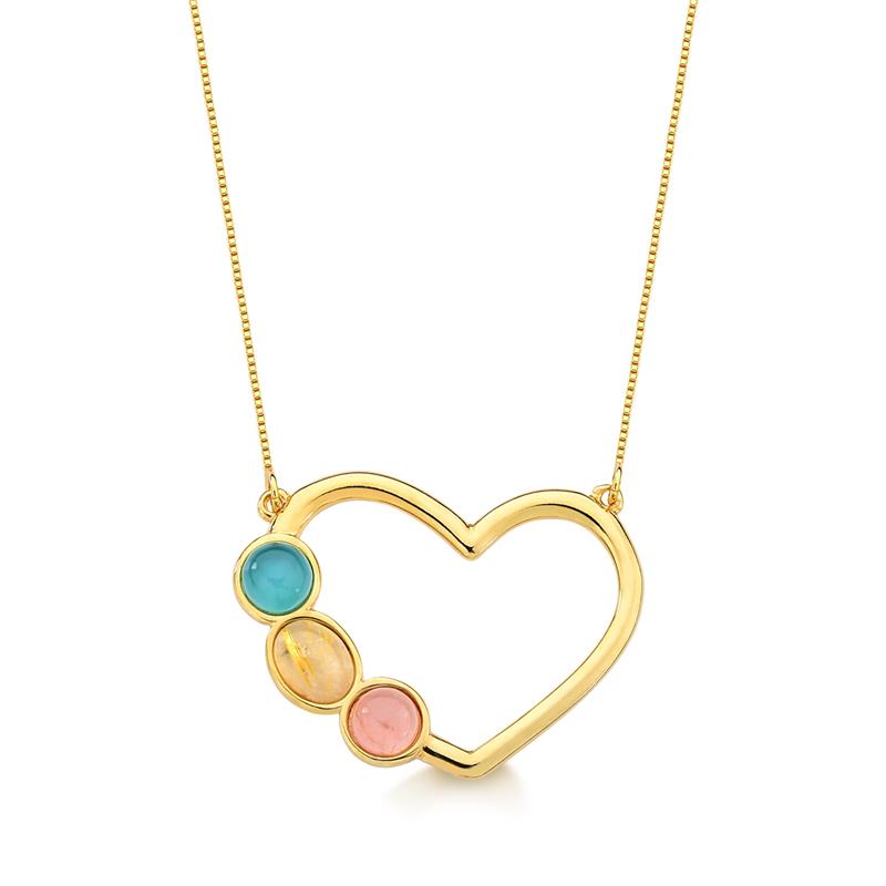 LINHA BÁSICA. Pingente com formato de coração, com três pedras naturais: uma oval de 8x6mm e duas pedras redodas de 6,5mm. Acompanha corrente Veneziana estilo borboleta de 40cm. Por possuir três pedras, o pingente permite compor composições únicas e diferentes. Altura do pingente: 3,0cm.