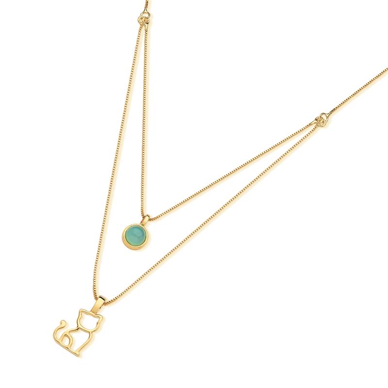 COLEÇÃO PETS.Pingente com pedra cabochão, no formato redondo de 6,5mm. Acompanha pingente de gatinho em metal. Possui corrente veneziana de duas alturas de 43cm a parte mais longa, e a parte mais curta fica na altura de 35cm. A união pela paixão aos pets e o poder das pedras naturais, deixa esta peça ainda mais apaixonante e delicada.