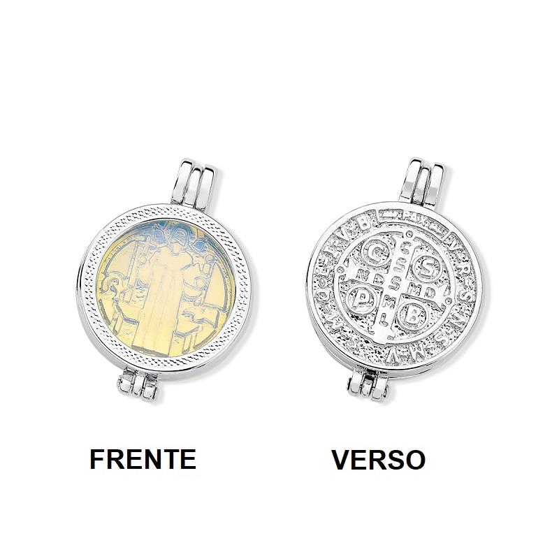 COLEÇÃO RELICÁRIO.Pingente relicário, com pedra cabochão, no formato redondo de 20mm. Possui detalhes no seu interior, trazendo a figura de São Bento, considerado o santo protetor das mulheres e um grande protetor contra a inveja. No seu verso possui a Cruz de São Bento com inscrições, sendo assim considerada um dos mais poderosos escudos protetores contra todo e qualquer mal. A peça pode ser usada dos dois lados.