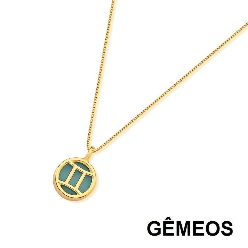 COLEÇÃO SIGNOS, Pingente do signo de Gêmeos, com pedra chapa no formato redondo de 12mm. Corrente Veneziana de 43cm + 7cm de extensor. Tamanho do pingente: 2cm.