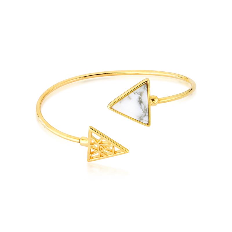 COLEÇÃO TRAMA. Pulseira estilo bracelete com pedra de chapa em formato de triângulo 14x14mm. Possui também detalhes em metal transformando-se em tramas.